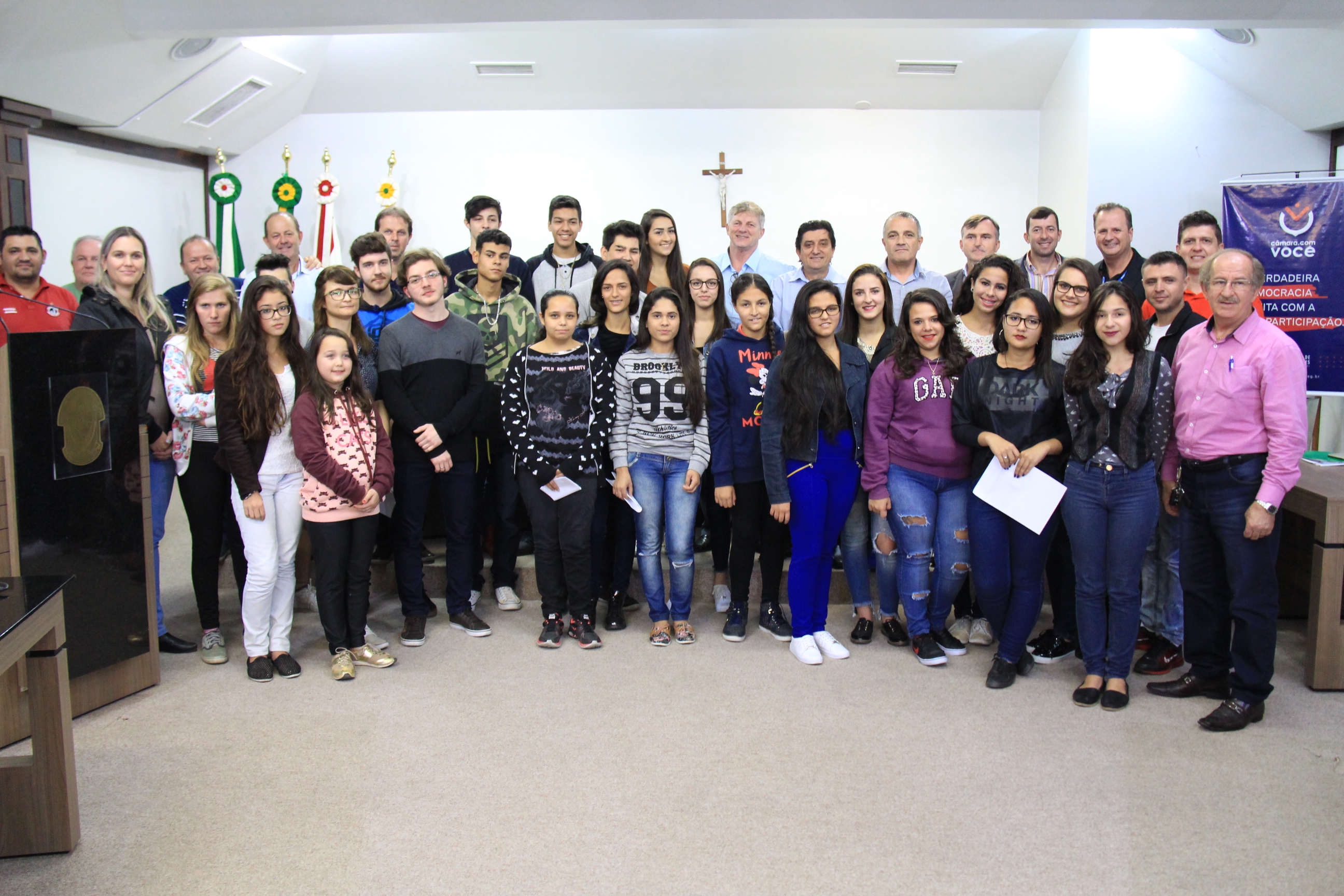 Alunos das Escolas Elza Granzotto Ferraz, Alvino Tribess e do IFSC participaram da sessão ordinária desta terça-feira (27), na Câmara de Vereadores de Jaraguá do Sul. Foi a segunda etapa do programa Câmara.com você para estes alunos. As turmas receberam a visita da equipe entre os meses de maio e junho. No contato com o Poder Legislativo, os estudantes entregam uma carta com reivindicações aos parlamentares.