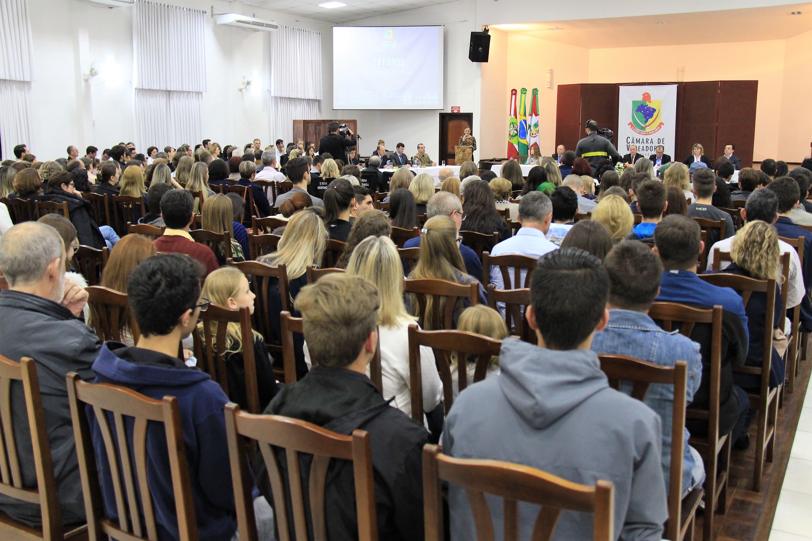 A Câmara de Vereadores realizou nesta quinta-feira, 17, Sessão Solene em homenagem aos 141 anos de Jaraguá do Sul (Colonização e Emancipação). Na oportunidade foram homenageados os dois hospitais (São José e Jaraguá) e as dez escolas centenárias do município.