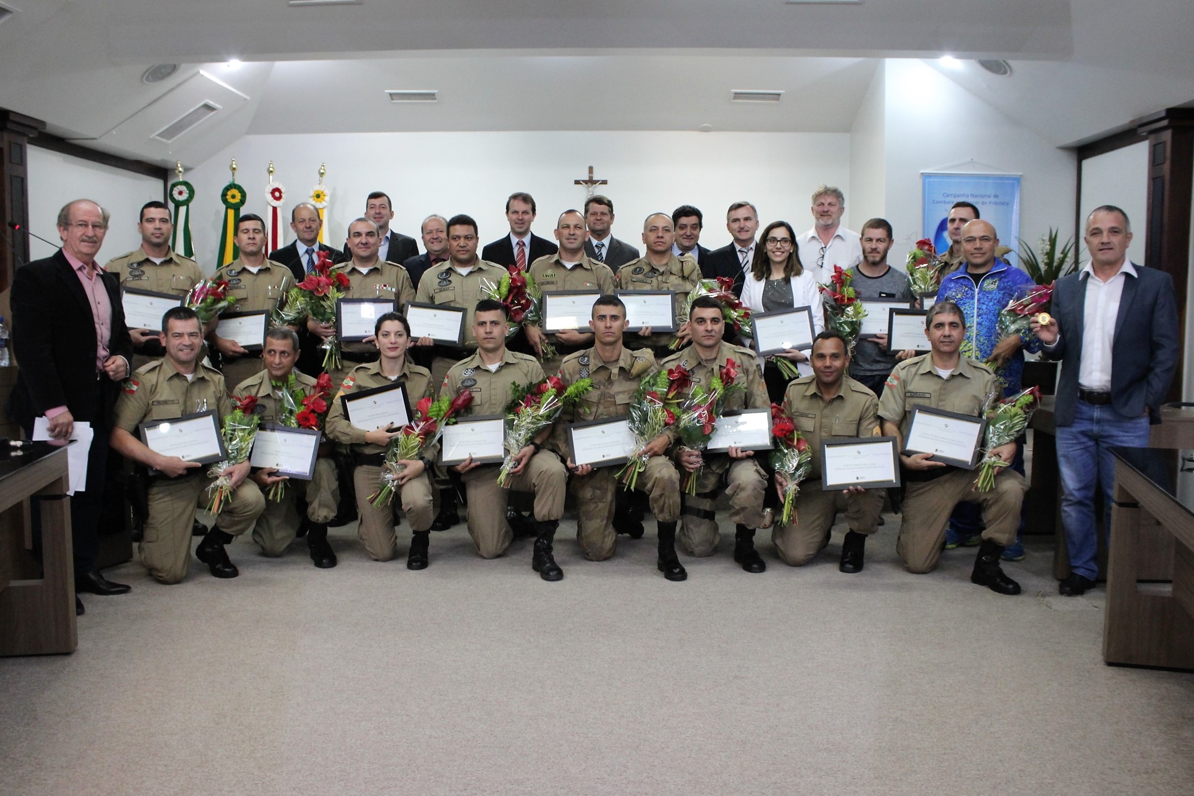 A Câmara de Vereadores homenageou, em sessão solene, nesta quinta-feira (09), 17 policiais do 14º Batalhão de Polícia Militar que integraram equipes da Força Nacional de Segurança, em missões pelo país. A proposição de autoria do vereador Ronaldo de Souza (Magal), teve o objetivo de valorizar os policiais do município.