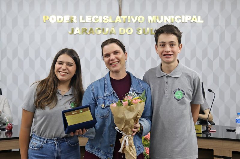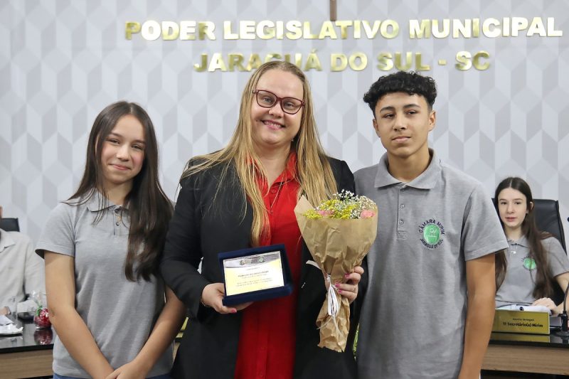 A educação foi destaque na sessão solene promovida pela Câmara Mirim de Jaraguá do Sul na manhã dessa quarta-feira (22). No Plenário Victor Bauer, os jovens parlamentares indicaram e homenagearam doze professores de diversas unidades escolares do município. O evento ressaltou a relevância dos educadores após a comemoração de seu dia, que ocorreu na última quarta (15).