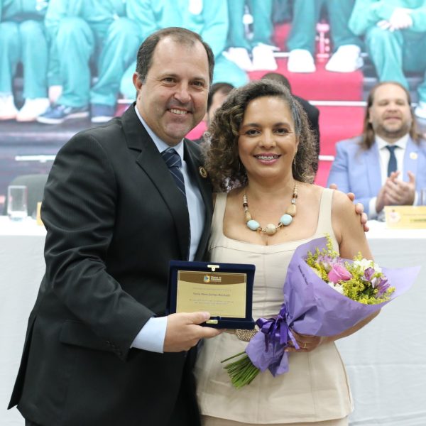 Além da entrega da medalha, onze professores indicados pelos vereadores foram homenageados com placas e flores, em reconhecimento às suas trajetórias dedicadas ao ensino: