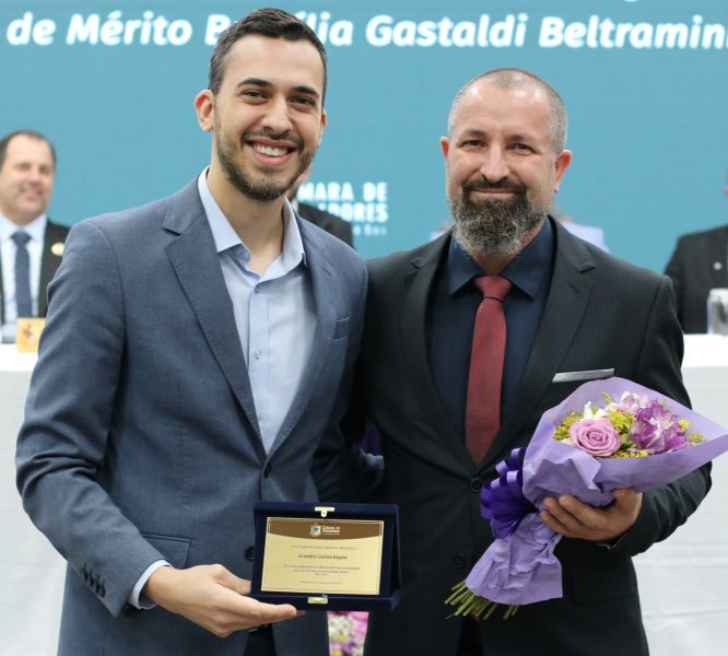 Homenageado pelo vereador Rodrigo Livramento (Novo), o professor Evandro Carlos Vegini é reconhecido por sua versatilidade e comprometimento com a formação humana e intelectual dos alunos. Com mais de 30 anos de atuação, transmite não apenas conhecimento, mas também valores que inspiram e transformam vidas.