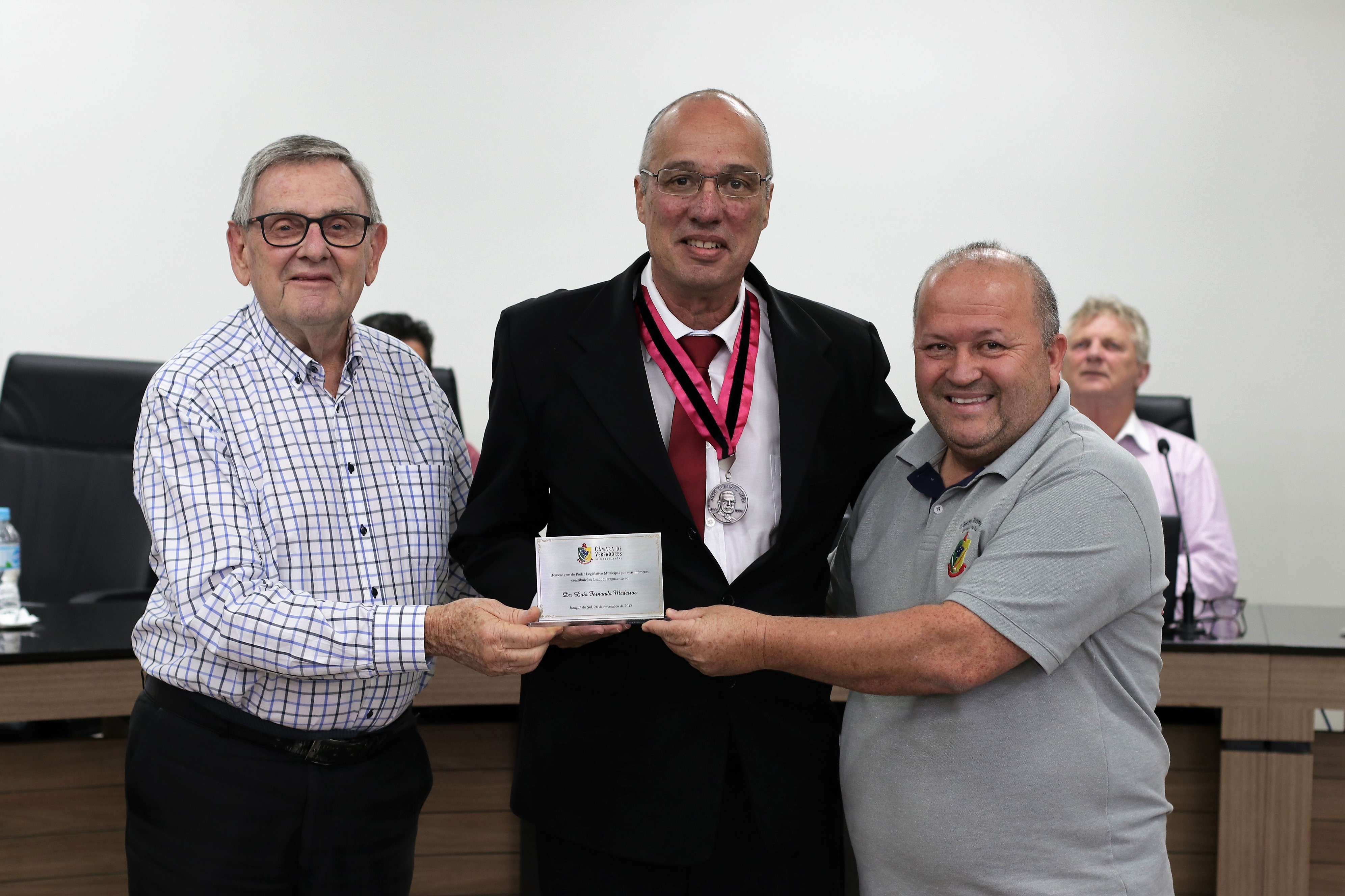 A Câmara de Vereadores de Jaraguá do Sul, na sessão desta terça-feira (26), homenageou o odontologista e servidor público do município, Luís Fernando Medeiros, pela conquista de uma cadeira na Academia Catarinense de Odontologia no último dia 22 de novembro. Ele recebeu placa das mãos do presidente do Legislativo, Marcelindo Carlos Gruner (PTB).