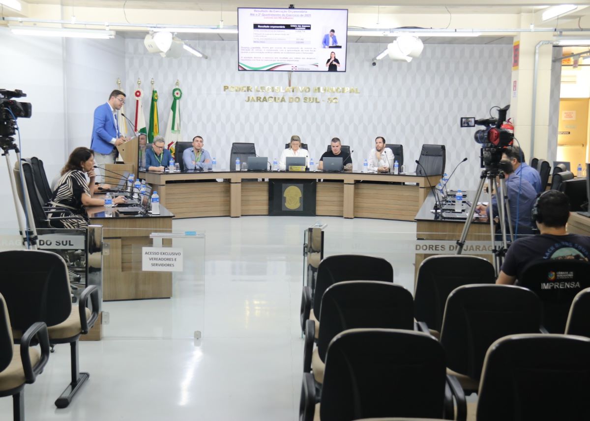 Na tarde desta segunda-feira (29), a Secretaria Municipal da Fazenda fez a audiência pública de prestação de contas referente às metas fiscais do 2º quadrimestre de 2025, na Câmara Municipal de Jaraguá do Sul. O encontro foi presidido pela vereadora Professora Natália Lucia Petry (MDB) e contou com a participação do secretário da Fazenda, Tiago Coelho Przywitowski, do contador municipal, James Severien, e do coordenador de Controle Interno, Leonardo Ávila Custódio. O objetivo foi detalhar o desempenho das receitas e despesas do município, além de avaliar o cumprimento dos limites legais e a situação da dívida pública.