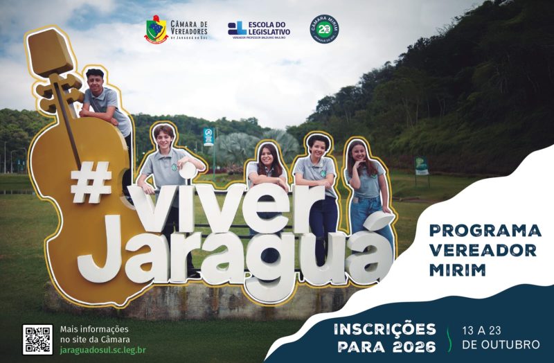 As inscrições das escolas no Programa Vereador Mirim 2026 acontecem de 13 a 23 de outubro de 2025, sendo que as escolas interessadas em participar do Programa deverão se inscrever no site da Câmara de Vereadores de Jaraguá do Sul conforme o Edital (disponível no final da página).