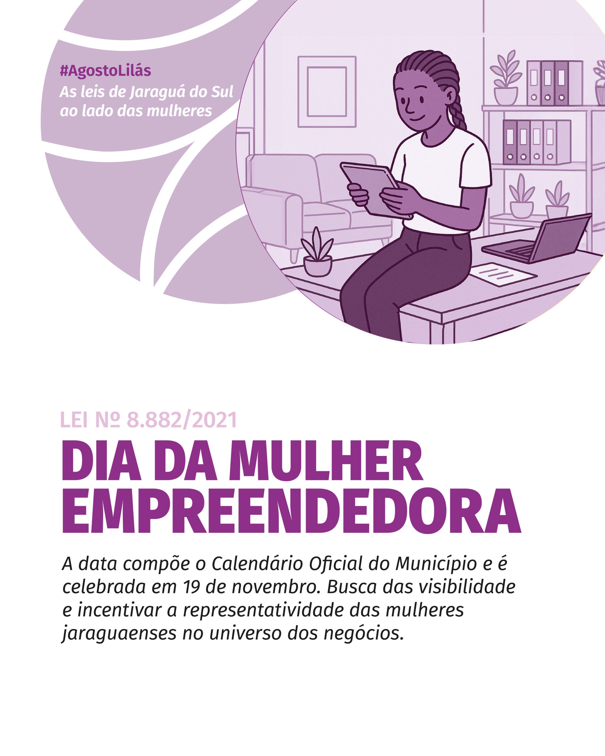 A participação de mulheres nos ambientes de negócios é incentivada por meio do Dia da Mulher Empreendedora, comemorado anualmente em Jaraguá do Sul no dia 19 de novembro. A data foi criada por meio da lei nº 8.882 e faz parte do Calendário Oficial de Eventos do Município. A iniciativa é de autoria da vereadora Nina Santin Camello (legislatura 2021-2024) e promove uma oportunidade de valorização para o trabalho e a iniciativa de mulheres em empresas e negócios próprios.