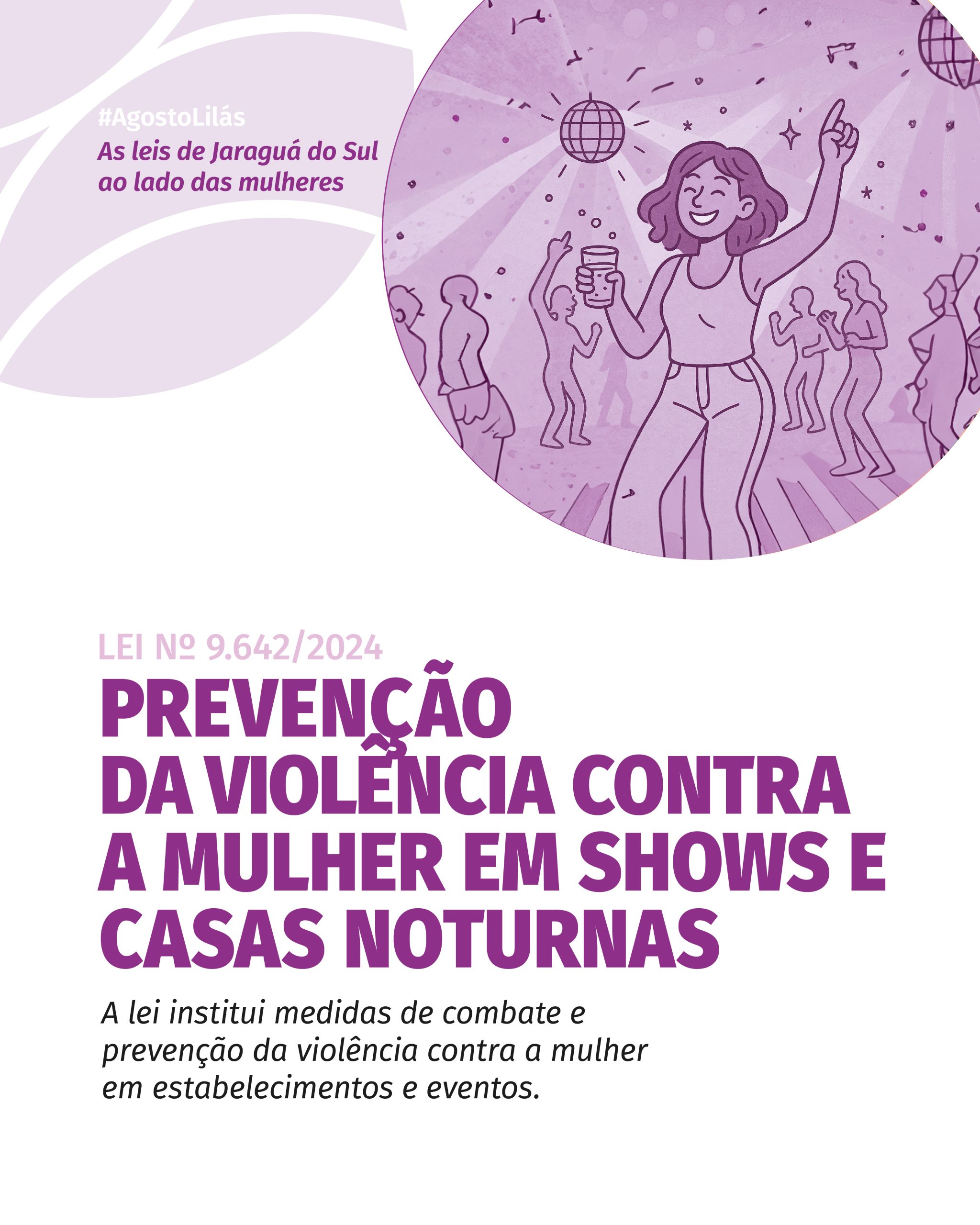A prevenção contra a violência em casas noturnas, restaurantes, bases, restaurantes e casa de eventos é um direito garantido pelas mulheres de Jaraguá do Sul. A lei que fornece essa garantia, aprovada pela Câmara Municipal em 2024 (lei 9.642) e de autoria dos vereadores Sirley Maria Schappo (Novo), Nina Santin Camello (legislatura 2021-2024) e Ronnie Leonel Lux (legislatura 2021-2024), estabelece que, em caso de ataque à integridade física de qualquer mulher em algum desses locais, os colaboradores devem tomar providências para garantir sua segurança.